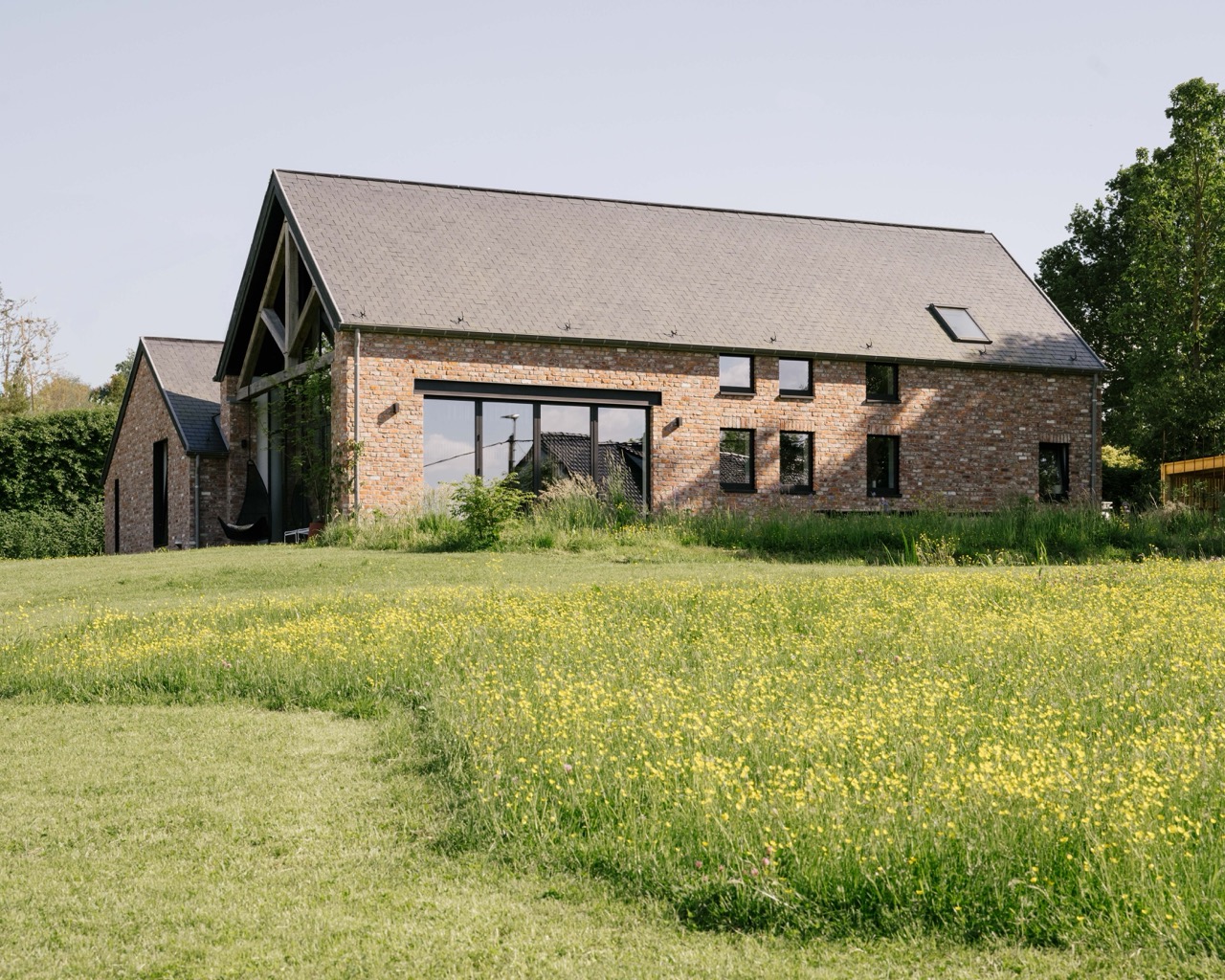 En lisière de village, l’Atelier d’Architecture d’Hoop Bergé conçoit une maison unifamiliale structurée autour d’un patio central, organisant le plan ouvert et apportant lumière et respiration aux espaces. Deux volumes parallèles, asymétriques et légèrement décalés, s’inscrivent avec justesse dans le relief naturel et le cadre rural environnant. L’architecture joue sur un équilibre entre retenue et ouverture : des façades sobres préservent l’intimité côté village, tandis que de larges ouvertures cadrent la campagne au nord, dans un dialogue subtil entre tradition et contemporanéité. La structure en ossature bois, ponctuée de fermes en chêne et d’éléments en acier, affirme une matérialité honnête et durable, issue de filières locales.